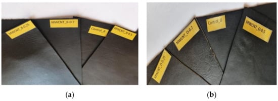The experiments were done on bovine and sheepskin crust leather surfaces with concentrations of MWCNTs of 0.25%, 0.5%, and 0.7% reported to finishing composite weight. Treated bovine leathers were encoded as MWCNT_B-0.25, MWCNT_B-0.50, MWCNT_B-0.70, and treated sheepskin leathers were encoded as MWCNT_O-0.25, MWCNT_O-0.50, MWCNT_O-0.70, while the control samples were Control_B and Control_O (Figure 2).