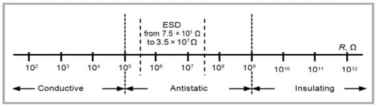 - SR EN 1149-1:2006. Îmbrăcăminte de Protecţie. Proprietăţi Electrostatice. Partea 1: Metodă de Încercare Pentru Măsurarea Rezistivităţii de Suprafaţă; ASRO: Bucharest, Romania, 2006. [Google Scholar]