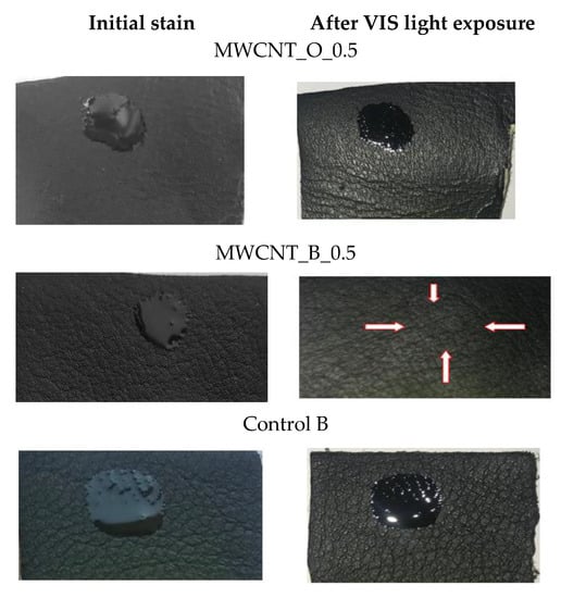 Leather durability is considered as an ecological treat that can prolong the life cycle and minimize the pollution. Leather items can be covered with soil resistant film forming polymers [], can be dry-cleaned by using organic solvents, and can be restored by refreshing the initial finishing cover. All these actions are time, materials, and labor consuming, with a high ecological impact for the environment when organic solvents are used. In this context, photocatalytic nanomaterials with self-cleaning properties can contribute to leather item durability and consumer comfort. Some papers have investigated the self-cleaning properties of leather surfaces treated with nano TiO2 [], and doped nano TiO2 []. In our present research, we performed some trials regarding the self-cleaning properties of leather surfaces against olive oil as a model for leather soiling with fatty substances. After the exposure of selected and control leather surface samples to visible light, we discovered that the olive oil stain was no longer visible after 6 h on the MWCNT_B-0.5 sample compared to the control and MWCNT_O-0.5 sample. In Figure 4, it can be seen that only the stain contour can be recognized compared to the other samples for which the olive oil drop was almost unchanged. The decomposition of the olive oil stain on sheepskin leather surface occurred after 22.5 h of visible light exposure for the MWCNT_O-0.5 sample. The same experiments performed on leather surfaces covered with 0.7% MWCNTs on both surface types (bovine and sheepskin) showed that the olive oil decomposed after 7 h and 12.5 h of visible light exposure, respectively (not showed here).