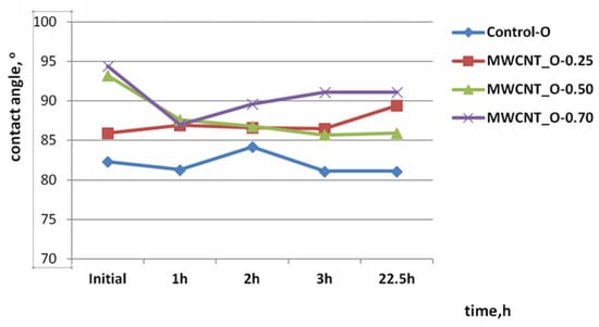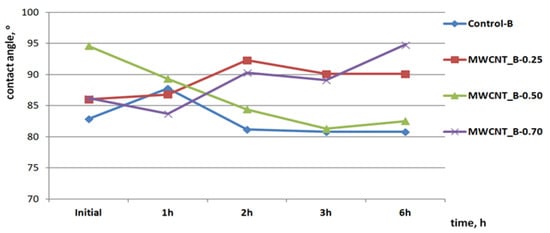 The mechanism of self-cleaning properties was indirectly investigated by measuring the water drop contact angle in static and dynamic conditions by using aa VGA Optima XE Contact Angle Measurement device (AST Products, Inc., Billerica, MA, USA). The development of hydrophilic properties under Vis light exposure after 1, 2, 4, and 6 h were attributed to the formation of reactive oxygen species due to the specific surface chemistry and nanosize of MWCNTs in the interaction with water molecules from air [].