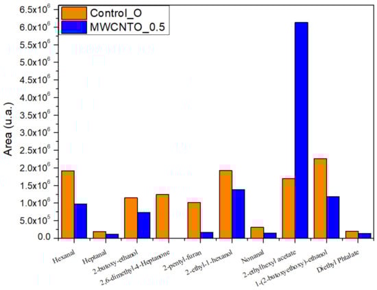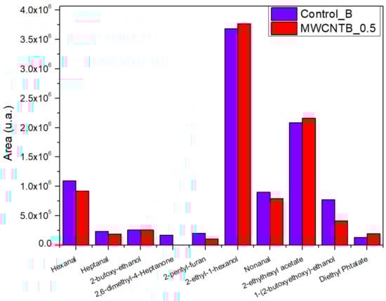 According to the measurements by HS-GC analysis, in all samples, we identified aldehydes (hexanal, heptanal, nonanal) and a heterocyclic organic compound (2-pentyl-furan), side products of natural fats originated from raw hides or fat liquoring materials; alcohols (2-butoxy-ethanol, 2-ethyl-1-hexanol, 1-(2-butoxyethoxy)-ethanol), an ester (2-ethylhexyl acetate), and a phthalate (diethyl phthalate) generated by finishing solvents and other additives like plasticizers []. Most of these compounds were found in lower quantities in MWCNTs treated bovine and sheepskin leathers compared to the control samples (Figure 7 and Figure 8). It was also found that the compound 2,6-dimethyl-4-heptanone, a specific volatile organic compound for the leather industry that can be found in wastewater treatment plants and is associated with leather odor [], does not exist in MWCNTs treated bovine and sheepskin leathers. We assumed that because the ovine leathers were thinner than bovine leathers and their surface was larger for the same weight sample that fewer volatile compounds would be found in higher quantities compared to the control sample and bovine leathers (Figure 8). Further investigations will be performed in this promising area of research in light of the optimum time and temperature condition settings for a reduction in VOCs.