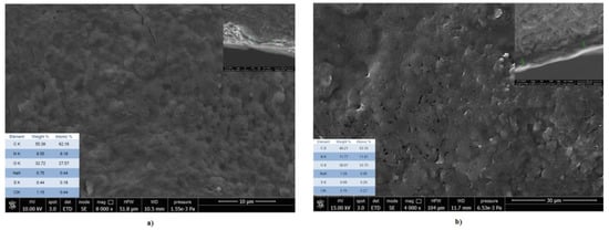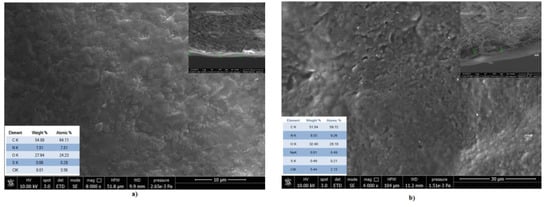 EDX analyses confirmed a higher concentration of oxygen on the leather surfaces treated with MWCNTs compared to the classical surfaces (inset images), in agreement with XPS analyses. The presence of 4.15–9.0 wt% O in pristine MWCNT compositions was also reported [,].