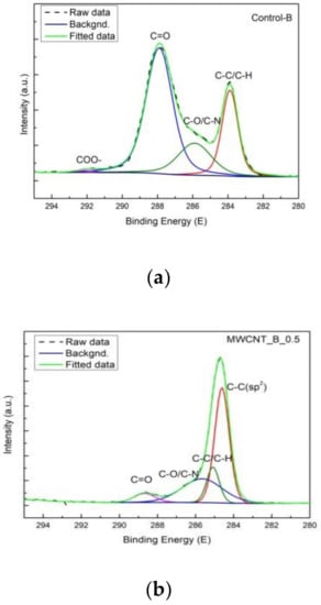 XPS analysis was done to investigate the surface chemistry (i.e., C, N, O elements chemical states, binding energy) for the control and functionalized leather samples. Figure 11 shows the identified peaks for C1s corresponding to: C–C/C–N at 284.8 eV, C–O/C–N at about 286 eV, C=O at 288 eV with an additional peak only for MWCNT_B_0.5 at 284.4 eV, corresponding to C–C (sp2). The peak at about 290 eV, corresponding to COO- in the pristine sample disappeared for the treated sample. Regarding O1s binding energy, the peak at 535.17 eV, present in the control sample and attributed to C–O and C=O, disappeared for the MWCNT_B_0.5 sample. These differences suggest a potential interaction of carboxylic and carbonyl groups from the binder composite with MWCNTs on the leather surface.