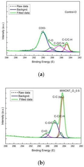 The increased concentration of oxygen on the MWCNT surface was attributed to the free electron interaction with carboxylic groups with an effect on reduced mobility [] and lower performances in reactive species generation. The increased concentration of oxygen on the sheepskin surface can be attributed to MWCNT agglomeration and potential interaction with functional chemical groups of composite binders with an effect on lower performance in oil stain decomposition.