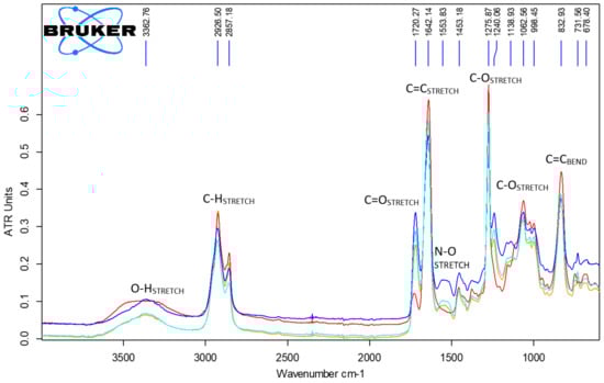 Figure 13 shows the best quality spectra of each control and functionalized sample. The main functional groups vibration modes: O–H, C–H, N–O, C–O, C=O, C=C stretching and C=C bending of nitrocellulose, acrylic, and carbon nanotube structures were identified, confirming the presence of the surface treatment [].