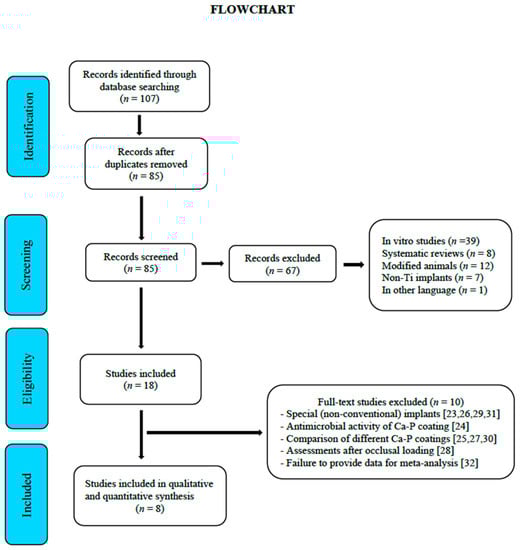 The initial electronic search yielded 107 references. After eliminating duplicates and irrelevant articles based on their title and abstracts (in vitro studies, systematic reviews, modified animals, non-Ti implants, and articles in other languages), 18 full texts were selected [,,,,,,,,,,,,,,,,,]. The concordance between reviewers (N.L.-V., A.L.-V.) was 100% with a Cohen’s kappa index of 1 (overall concordance). The reasons for rejecting 10 studies out of the 18 selected were the following: use of unconventional implants [,,,], comparing different apatite veneers [,,], assessing parameters after occlusal loading [], assessing the antimicrobial activity of the Ca-P veneer [], and not providing data for meta-analysis []. Finally, eight studies were selected for the meta-analysis [,,,,,,,] (Figure 1).