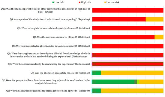 The Systematic Review Centre for Laboratory Animal Experimentation (SYRCLE) risk of bias tool, an adapted version of the Cochrane RoB tool with specific biases in animal studies), was used to assess the methodology of the scientific evidence in all selected studies [].