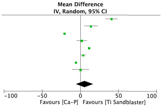 The same studies included in the qualitative synthesis were used to perform a meta-analysis comparing Ca-P-coated Ti implants with etched Ti implants, with a total of 455 implants being evaluated. A meta-analysis of adverse outcomes could not be performed due to lack of data. All included studies [,,,,,,,] assessed BIC 4 weeks after placement. Heterogeneity was very high (I2 = 99%) (Table 5)). Figure 3 shows the forest plot for the meta-analysis.