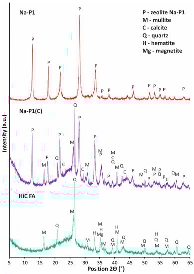 Diffractograms of the phase composition of high-carbon fly ash, Na-P1(C) composite and pure Na-P1 zeolite are shown in Figure 6.