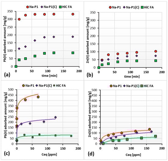 The performed measurements allowed us to determine the time after which the amount of adsorbate on the solid surface did not change. As can be seen in Figure 8a,b, this time for the fly ash, zeolite and composite differs. Among the systems containing Pb(II) ions, the equilibrium was established the fastest in the case of Na-P1, i.e., after 30 min. For Na-P1(C) and HiC FA, this time was equal to 60 min. On the other hand, among the system containing Zn(II) ions, the equilibrium was reached after 120 min in all the studied systems. Thus, it can be concluded that in systems containing Pb(II) ions, the time required to reach equilibrium is shorter than in the case of systems containing Zn(II) ions.