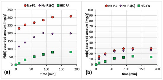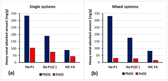 Figure 9a,b show adsorption kinetics of Zn(II) and Pb(II) ions on the HiC FA, Na-P1, Na-P1(C) surfaces in systems containing both ions simultaneously. In turn, Figure 10a,b present a comparison of the absorbed amount of Pb(II) or/and Zn(II) on the high-carbon fly ash, zeolite and zeolite–carbon composite surfaces in the single and mixed systems.