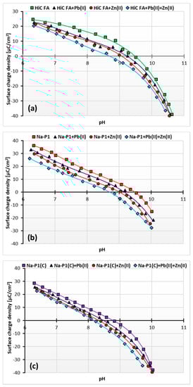 Figure 11a–c show changes in surface charge density of the HiC FA, Na-P1 and Na-P1(C) solids as a function of solution pH, depending on the added adsorbate. In turn, Table 5 shows the changes in the pHpzc (pzc—point of zero charge) values of the adsorbent particle in the examined systems of adsorbates.