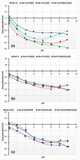 The pHiep values of the adsorbent particles in the studied systems are not in the range of the tested pH values. This indicates that pHiep is below the value of 3. This applies, for example, to systems with Na-P1, both without adsorbates and with one or two adsorbates, as well as to Na-P1(C) (in systems with Zn(II) ions and Pb(II) and Zn(II) simultaneously) and HiC FA (without adsorbates and with Zn(II) ions). The isoelectric point of Na-P1(C) is located at pH about 4 and decreases to the value 3.2 with the addition of Pb(II) ions. For suspensions containing HiC FA, the most significant decrease in zeta potential is observed. It is manifested by a change in pHiep value from 3.2 for the system with Pb(II) ions to 3 for the system with Zn(II) and Pb(II) ions.