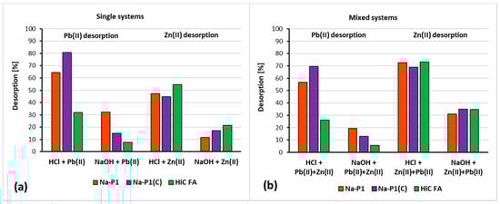 Desorption (%) of Zn(II) and Pb(II) ions from the HiC FA, Na-P1 and Na-P1(C) surfaces in single (a) and mixed (b) systems using 0.1 M HCl or 0.1 M NaOH.