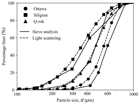 The grain size distribution curves from the sieve analysis for the three sands are shown in Figure 4. The maximum particle size for Ottawa and Q-Rok was around 850 and the minimum particle size was around 300 and 150 , respectively. For Siligran the maximum particle size was 710 and the minimum particle size was 125 . The mean particle size (D50) and coefficient of uniformity (Cu) were 598 and 1.43 respectively for Ottawa sand, 470 and 1.74 for Q-Rok and 380 and 2.21 for Siligran. The classification for all three sands was poorly graded sand (SP) as per the Unified Soil Classification System, ASTM-D2487 [54]. The soil classifications and the values for , and are presented in Table 1.
