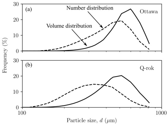 The volume distribution can be converted to number distribution of equivalent sphere sizes albeit with the introduction of certain error due to the assumption of spherical particle shape. The volume distribution and number distribution obtained from the light scattering technique for uncrushed Ottawa sand and Q-Rok are shown in Figure 5. The of the volume distribution for Ottawa sand and Q-Rok is 514 mm and 435 mm respectively, and 405 mm and 302 mm in the number distribution. The difference in volume and number distribution is greater in Q-Rok because of the presence of finer particles.