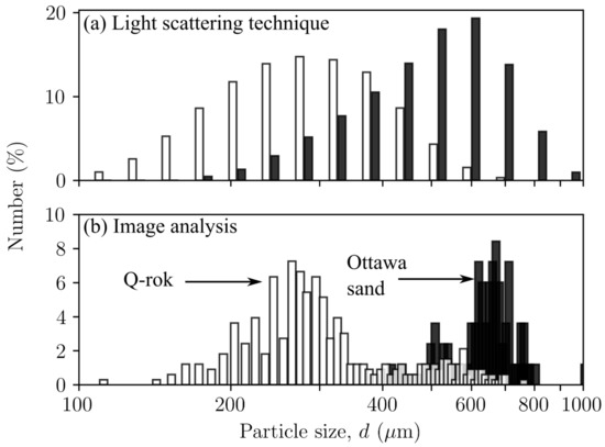The image analysis evaluates particle sizes as equivalent area diameter based on 2D images. This method also suffers from small specimen volume. Less than 1 mg of sand was deposited on the glass slides for imaging. However, with proper sampling technique the results from image analysis are not very different from those obtained from the laser light diffraction technique for number distribution as shown in Figure 6. Though, it is not a common practice, particle size distributions from image analysis and laser diffraction have even been combined to study particle crushing [37].