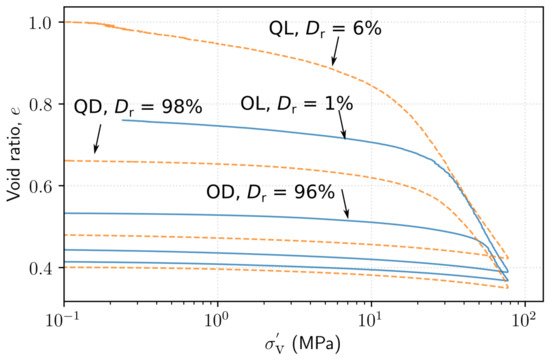 The results of the 1D compression tests for the loose and dense specimens of Ottawa sand (OL and OD) and Q-Rok (QL and QD) are presented in Figure 7. The initial void ratios for OL and OD were 0.76 and 0.53 respectively while those for QL and QD were 1.01 and 0.67. Threshold stress is defined as the stress where the slope of the curve increases appreciably with the initiation of particle crushing. The threshold stresses for OL and OD were 27 MPa and 48 MPa respectively, and 12 MPa and 22 MPa for QL and QD, on average an 80% increase. Densification increases the threshold stress and the threshold stress for QD was comparable to OL but smaller than OL. The response of QD was similar to OL in terms of threshold stress, void ratio reduction and compression index. At high stresses the normal compression lines (NCL) for OL, OD and QD converge and approach the same compression index () value of 0.60 at around 70 MPa axial stress. The for QL was 0.60 until 50 MPa after which the curve starts to flatten resulting in a smaller value of 0.55. No effort was made to reduce the side wall friction and hence the void ratios in these tests may be higher than they would be if side walls were frictionless [52]. The frictional sidewall and may also explain the higher final void ratio for loose specimens than dense specimens as loose specimens experience larger strain, and hence more energy may be lost in sidewall friction. At high stresses beyond the threshold stress, NCLs for specimens prepared at different densities converge, thus resulting in a unique NCL [27,52]. Though the grain shapes are very different, the grading of Ottawa sand and Q-Rok are similar, which may have led to the convergence of NCL. At high enough stresses particle breakage negates the influence of particle shape for similarly graded specimens to approach a unique NCL. The void ratios at the maximum stress were 0.388, 0.367, 0.423 and 0.350 for OL, OD, QL and QD respectively.