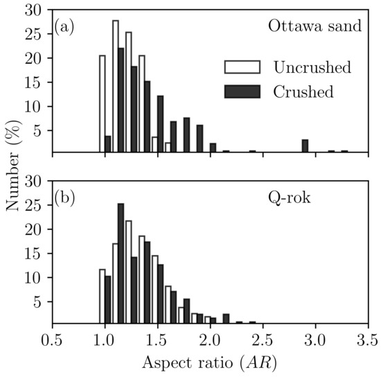 The evolutions of particle shape during 1D compression for OD and QD are shown in Figure 9. There is an increase in the aspect ratio of the particles for OD and decrease in the aspect ratio of the particles for QD. Aspect ratio is defined as the ratio of the major to the minor axis of the ellipse fitted to the 2-D image of the particles. The implication is that rounded particles tend to fracture diametrically or cordially thus increasing the aspect ratio of the crushed particles [67], while asperities breaking in angular particles tend to make angular particles more rounded. The aspect ratio may continue to increase with increasing compressive stress [27].