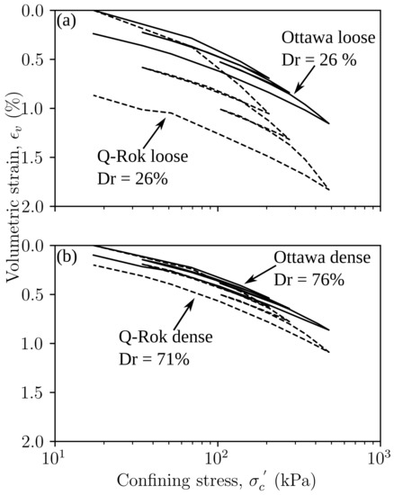 The results for the isotropic consolidation tests performed on loose and dense specimens of Ottawa sand and Q-Rok are shown in Figure 10. The volumetric response is non-linear over the range of stress applied. For the Ottawa sand, the volumetric strains at the maximum confining stress, , of 483 kPa was 1.16% for the loose specimen and 0.86% for the dense specimen. For the Q-Rok specimens the volumetric strains were 1.83% and 1.09% for the loose and dense specimens, respectively. The elastic rebound upon unloading to 17.2 kPa ranged from 0.92% to 0.76% for loose and dense specimens of Ottawa and 0.96% to 0.89% for loose and dense specimens of Q-Rok. There is significant improvement in volumetric behavior from densification. The total volumetric strain for the dense Q-Rok is similar to that for the loose Ottawa sand. The volumetric strain is influenced by both relative density and particle shape. However, particle morphology has a greater influence at low relative density. In addition, the total volumetric strain of the loose Ottawa sand specimen with of 0.69 and the dense Q-Rok specimen with of 0.72 are similar. This observation along with the 1D compression results indicate that void ratio could be a bigger influence than particle morphology in volumetric response under 1D and isotropic compression.