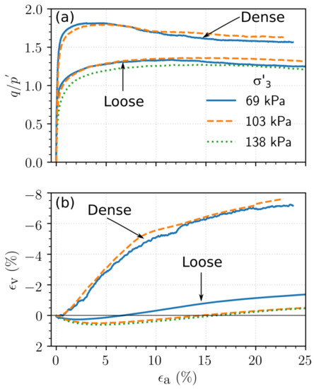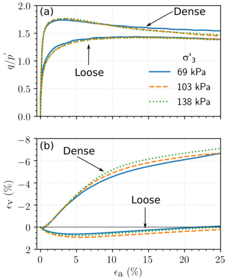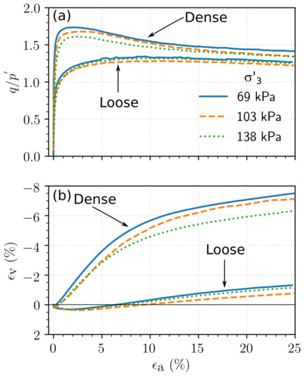 The results of the consolidated drained triaxial tests performed on the loose and dense specimens of Ottawa sand, Q-Rok and Siligran are shown in Figure 11, Figure 12 and Figure 13 respectively. The initial specimen states and pertinent test results are presented in Table 3. If no peak stress was observed, failure strain, , was chosen to be 15%. The stress ratio is defined as the ratio of the deviatoric stress and mean effective stress, , in which p and q are computed as shown Equation (3):