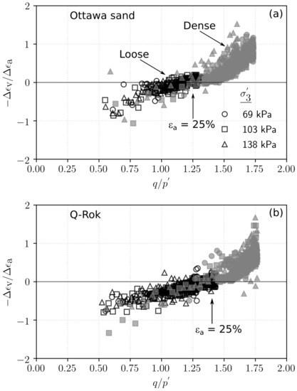 Stress–dilatancy plot showing the current rate of dilation for (a) dense and loose specimens of Ottawa sand, (b) dense and loose specimens of Q-Rok.