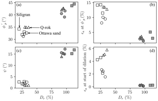 The effect of particle shape on test parameters are shown in Figure 17. Particle interlocking in angular sands leads to higher friction angle [22] as shown in Figure 17a. Though, Siligran is less angular than Q-Rok, the specimens are relatively denser thus the higher for the dense Siligran specimens. Additionally shown in Figure 17a are from Figure 15 and the relationship between roundness (R) and [12]. From Figure 16 and Figure 17, in general, relative density has a significantly greater influence on the behavior of granular specimens than angularity. However, the influence of angularity on is greater in loose specimens than in dense specimens. This is because angularity and the associated roughness affects the critical state behavior, , as shown in Figure 17a. However, the increase in strength from densification, , is similar for the different sands as seen in Figure 17c.