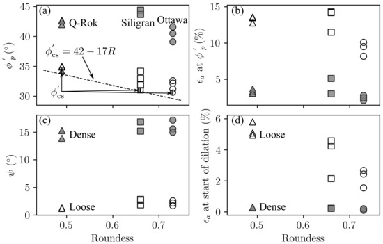 Effect of particle shape on strength and volume parameters in conventional drained triaxial testing: (a) peak friction angle, and the critical state friction angle relationship [12], (b) axial strain at peak friction angle, (c) dilation angle, (d) axial strain at the start of dilation.