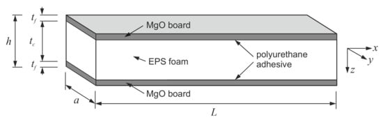 The subject of the present research is a CSIP with magnesium oxide board (MgO board) facings and an expanded polystyrene (EPS) core, bound together by a polyurethane adhesive (Figure 1). The MgO board is a relatively new cladding material, composed of a magnesia cement mortar matrix and a glass-fiber mesh reinforcement. Such use of the MgO board provides the panel with high strength and stiffness, immunity to biological corrosion, flame retardancy, and environmental sustainability [8,9,10,11]. The analyzed CSIP overcomes the disadvantages of a traditional SIP and allows to create more durable and eco-friendly buildings.