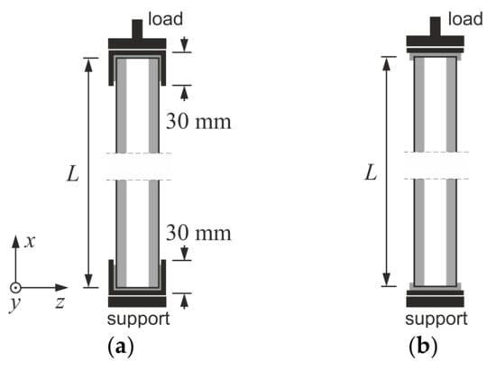 Small-scale edgewise compression tests were performed based on the procedure given in [28]. The tests were conducted on an Instron 5569 machine (Instron, Buckinghamshire, UK) using displacement control and a continuous recording of cross-head movement, ux, and reaction force, Fx. CSIP columns’ dimensions were assumed with a gradually increasing slenderness in an attempt to produce both facing yield and global buckling failure modes. Since the original panel was too thick to observe buckling behavior in small-scale, all specimens were modified by removing the central portion of the core and using an adhesive to create columns of reduced thickness. This interference in the composite layout did not influence the compressive behavior of the samples in any noticeable way. It was noted that the EPS cores of the source panels had two different densities: 15 kg/m3 (EPS15) and 21 kg/m3 (EPS21). Other than that, the cross-section of all samples remained constant, and three different heights were considered (Table 1). In the case of L1 and L2 columns, support profiles with 30 mm high flanges were used (Figure 2a). The flanges were discarded for the L3 column to reduce rotational stiffness and increase slenderness (Figure 2b). A stabilizing layer of mortar was applied in all cases to ensure uniform stress distribution.