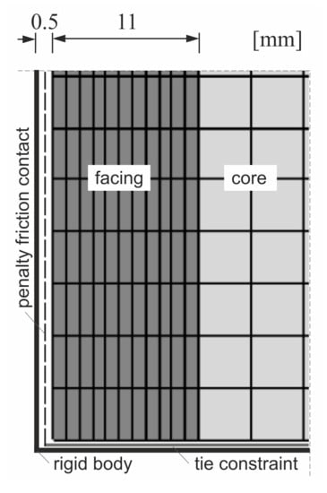 A continuum approach was taken and all simulations were performed in plane stress state. The test samples were discretized using four-node elements with reduced integration and hourglass control. A regular geometry mesh established in a convergence study, consisting of 4 mm × 4 mm elements in the core area and 1 mm × 4 mm in the facings, was used in all cases (Figure 5). Sample dimensions and layer arrangements were adopted in accordance with Table 1. Perfect bonding was assumed between facings and core constituents since no pre-failure delamination was observed in laboratory tests.