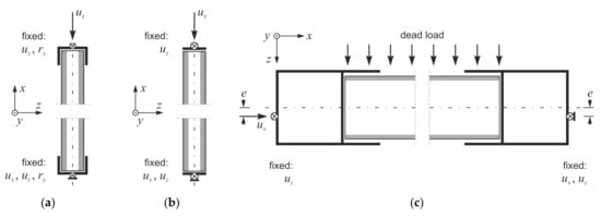A full-scale CSIP compression test procedure was developed based on small-scale research and panel application guidelines provided by the producer. The test stand comprised an Instron Labtronic® 8800 structural testing system (Instron, Buckinghamshire, UK) with a NBC Elettronica TA10 load cell (N.B.C. Elettronica Group s.r.l., Delebio, Italy) and a tested panel (LS Tech-Homes S.A., Czechowice-Dziedzice, Poland) mounted horizontally in two steel profiles acting as pin supports (Figure 3). The mounting profiles were designed to warrant sufficient rigidity with 165 mm distance from a panel’s edge to the pin, and a 100 mm high flange (Figure 4a). A stabilizing layer was used between the sample and the profiles for uniform stress distribution. The assembly was attached to a steel frame, that allowed for a horizontal movement of the loading profile (Figure 3b) and blocked all translations of the support profile (Figure 3c). The connection between the pin supports and the steel frame allowed to apply loads with a set eccentricity value. Three levels of eccentricity were selected to produce a substantially varied response: 0, d/6 (27 mm) and d/3 (54 mm), where d is distance between facing centroids, d = h − tf. All tests were performed under displacement control with continuous recording of reaction force, Fx, horizontal displacement, ux, using cross-head movement and a linear variable differential transformer (LVDT), vertical displacements, uz, using LVDTs, and facing longitudinal strains, εx,f, using strain gauges (SG). The measuring devices were LVDTs with a precision of 0.01 mm, and tubular strain gauges with a grid length of 60 mm. Measuring devices’ placement is shown in Figure 4b.