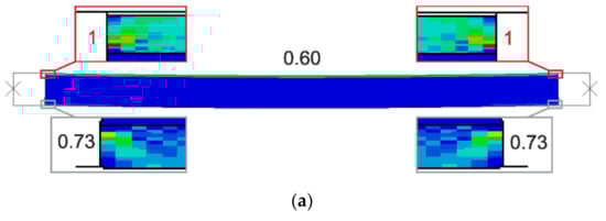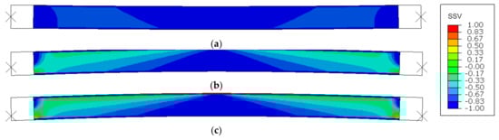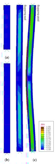 SSV distribution maps are presented in Figure 7. Only the MgO min variant is shown as MgO max outcomes are very similar. Both shorter samples, L1 and L2, were identified as wholly under compression (Figure 7a,b), whereas the highest column, L3, was recognized as under compression before buckling and shifted into a flexural deformation when the buckling occurred (Figure 7c). After the critical load was reached and further vertical displacement was applied, one facing remained nearly entirely under compression, and in the other substantial areas under tension appeared in the center and near the supports. All of the SSV maps depict physically reasonable behavior and exemplify that the author’s procedure works as intended.