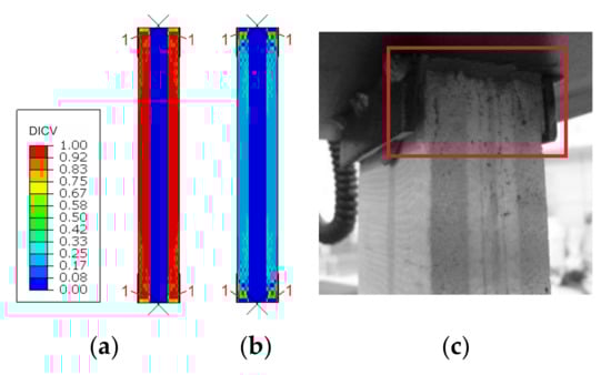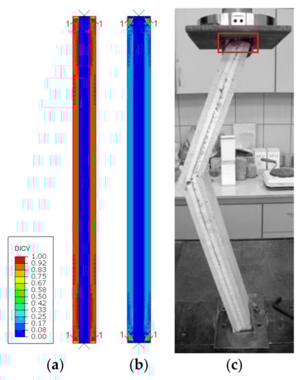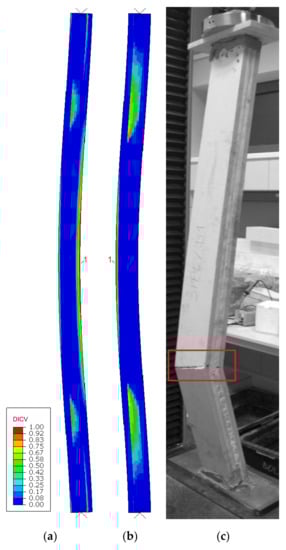 Failure modes are presented as experimental observations and DICV distributions in Figure 8, Figure 9 and Figure 10. In both shorter samples, L1 and L2, the failure initiated on the edges of the facings, in the contact zone with the support profiles, and in both cases, the computational predictions agree with laboratory test observations (Figure 8 and Figure 9). No flexural deformation occurred in the L1 sample throughout the experiment, neither in laboratory specimens nor in their numerical representation. A post-failure deflection occurred in the L2 sample laboratory test (Figure 9c), but since the FEA’s focus was on the failure initiation, this behavior was not investigated further in simulations (Figure 9a,b). The use of the MgO min and MgO max variants did not affect the location of failure initiation points, however, for MgO min, both facings were recognized as under significant strain with DICV values close to 1 across the whole area (Figure 8a and Figure 9a), whereas for MgO max, the peak DICV values appeared only in concentrated areas near the supports (Figure 8b and Figure 9b). A global buckling occurred in the highest column, L3, and failure initiated in its central section (Figure 10). It can be seen that the numerical sample deformed symmetrically (Figure 10a,b), whereas the physical specimen cracked around one-third of its height (Figure 10c). The imperfection of support conditions and sample positioning in the laboratory test was the most probable cause of this difference.