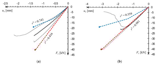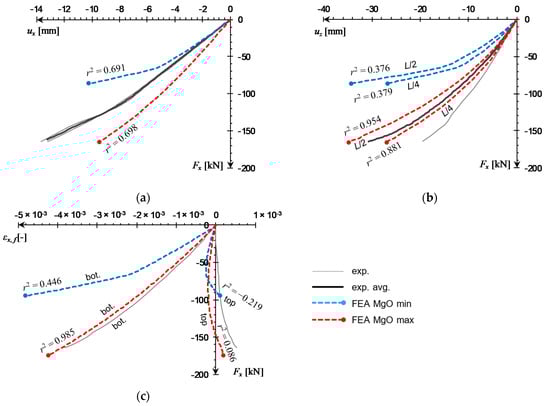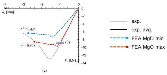 Force–displacement, Fx(ux), experimental curves for individual samples, averaged when more than one reading was available, are compared with FE model outcomes for MgO min and MgO max variants in Figure 11. Every computational curve was matched against a corresponding experimental curve by resampling the analyzed datasets in their shared domain and calculating a coefficient of determination, r2, used here as a measure of curve similarity [30]. The closer the r2 value is to unity, the stronger the resemblance of the computational curve to the experimental one.