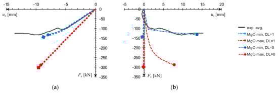 Examination of the L1 sample results shows that the material model variant outcomes encompass the experimental series quite well. The values of r2, obtained in relation to the averaged curve, range from 0.4 to 0.7 and similarity with individual laboratory specimens is even more pronounced (Figure 11a). The L2 sample FEA plot for the MgO max variant is in very good agreement with the averaged experimental data (r2 nearing unity) and a nearly exact match with one of the individual specimen results (Figure 11b). In the MgO min case, the plot shape diverges from experimental curves, but the predicted failure load is in a satisfactory agreement with the minimal laboratory reading.