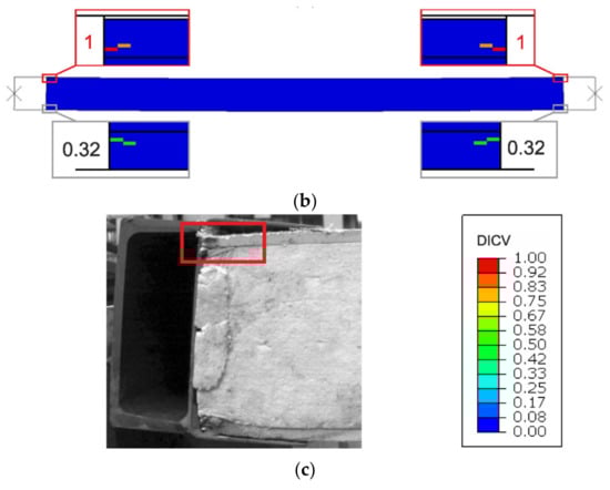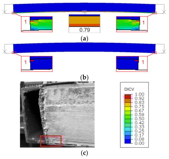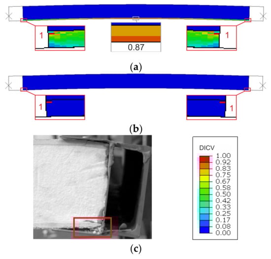 A comparison between failure modes predicted in FEA and those observed in experimental tests is presented in Figure 14, Figure 15 and Figure 16. It can be seen that the DICV values in the MgO min variants are distributed more evenly across the facing subjected to stronger compression (Figure 14a, Figure 15a and Figure 16a), while the MgO max variants result in maps with distinct peak values concentrated on facing edges, in the contact zone with loading profiles (Figure 14b, Figure 15b and Figure 16b). In all cases, the DICV distribution maps indicate failure initiation on the edge of the facing subjected to higher intensity compressive stress for both facing material variants, which results in failure of the top facing in the e = 0 case, and failure of the bottom facing in two remaining cases. All predicted failure locations are in agreement with experimental observations (Figure 14c, Figure 15c and Figure 16c).