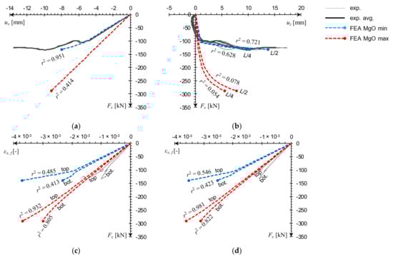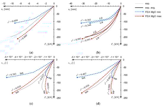 The results of both eccentric load tests exhibit a similar level of agreement between numerical and experimental curves. The numerical force–displacement curves place themselves concentrically around the experimental data (Figure 18a and Figure 19a) and force–deflection curves in mid- and quarter-span are close to laboratory measurements for the MgO max outcomes (Figure 18b and Figure 19b). It can be seen that the FE model is able to reproduce the flexural deformation quite well, with deflection in L/2 being slightly more accurate than in L/4. The distinction between L/2 and L/4 deflections is quite apparent, unlike the uniaxial load case, in which the difference is barely visible (Figure 17b). Force–strain curves obtained from the MgO max variant are in very good agreement with experimental measurements in the e1 test (Figure 18c,d) and for the bottom facing in the e2 test (Figure 19c). The laboratory measurements at the top facing in the e2 test indicate strain being negative in the initial loading stage, and transitioning into tension for the remainder of the test. Both numerical curves remained mostly in the negative strain range and transformed into tension only near the end of the simulation. This qualitative difference led to very low r2 values, however, shapes of numerical curves still resemble experimental ones quite well.
