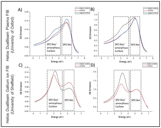 (A) SES for EBID HOPG, HOPG, and Aged HOPG collected in a Helios DualBeam Plasma FIB. (B) SES normalised to 5.2 eV-sp3 bonding peak for EBID HOPG, HOPG, and Aged HOPG collected in a Helios DualBeam Plasma FIB. (C) SES for EBID HOPG, HOPG, and Aged HOPG collected in a Helios DualBeam Gallium FIB. (D) SES normalised to 5.2 Ev-sp3 bonding peak for EBID HOPG, HOPG, and Aged HOPG collected in a Helios DualBeam Gallium FIB.
