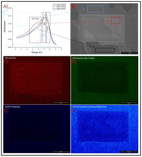 (A) Secondary electron spectra for EBID HOPG, HOPG and Aged HOPG collected in a Helios DualBeam Plasma FIB. (B) Presents an SE image of the region used for SES collection. (C) Presents SE chemical mapping of sp2/CHx. (D) Presents SE chemical mapping of sp3 bonding. (E) Present SE chemical mapping of CO/OH bonding. (F) Presents contrast enhanced SE chemical mapping of CO/OH bonding.