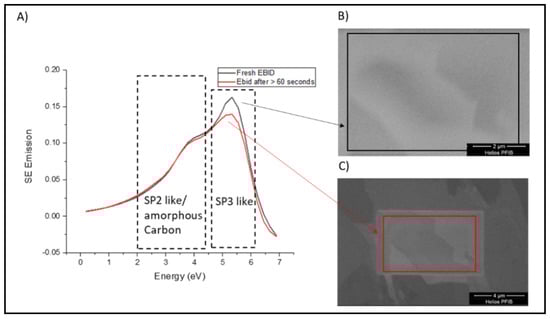 (A) Secondary electron spectra for Fresh EBID and EBID after >60 s collected in a Helios DualBeam Plasma FIB. (B) Presents an SE image (10 µm HFW) of the Fresh EBID region used for SES collection. (C) Presents an SE image (20 µm HFW) of the same region given in B however after >60 s which was then used for SES collection.