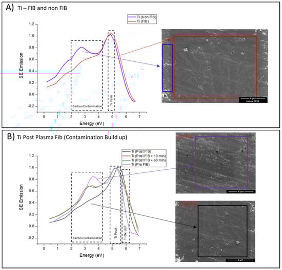 Two clear differences arise within the SES obtained pre and post FIB (Figure 4A,B). The first being the reduction of the peak situated between 2–4.3 eV, previously associated with primary surface ACC, post FIB exposure. The signal signature for this form of contamination is greatly reduced as the FIB window is created, and as post FIB SES indicate at the time points, it is observed that this contamination does start to return to the surface of the materials as the sample undergoes conventional SEM imaging. This finding revealed that as well as the ability of SES to monitor ACC, Plasma FIB Xe exposure has the capability to remove carbon contamination from the surface of Ti without the requirement for chemical surface treatments [23]. The removal of carbon contamination is seen as an advantage for IBID fabrication, notably for nanoconductors to improve the conductivity of the deposited material and to increase the tensile elasticity of FIB fabrication microstructures [17].