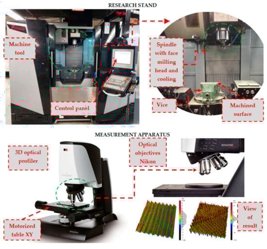 The 3D Optical Profiler S neox (Sensofar, Terrassa, Spain) with objective 5× EPI v35 (Nikon, Tokyo, Japan) was used for surface topography measurements of the analysed workpieces (Figure 2). During the investigation, the measuring system was controlled by SensoSCAN 6.6 software (2019, Sensofar, Terrassa, Spain) and the surface analysis was carried out using MountainsMap 7.1 software (2019, Digital Surf Headquarters, Besançon, France). The basic details of the measurement were set as follows: