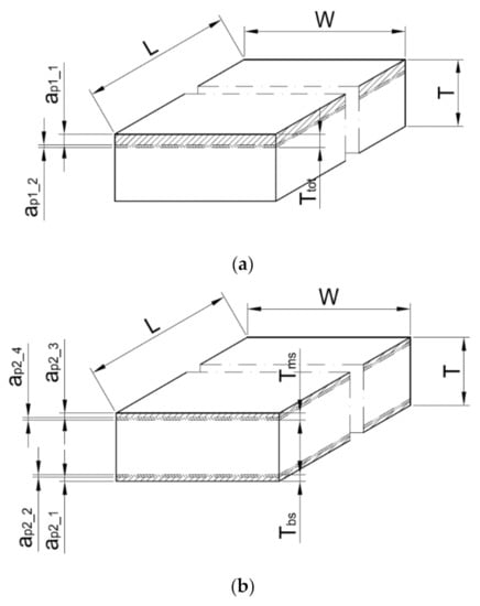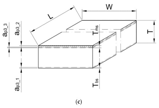 Three experimental research strategies for face milling of aluminium alloy plates: strategy S#1 (a), strategy S#2 (b) and strategy S#3 (c). Where: L—length of the sample (mm); W—width of the sample (mm); T—thickness of the sample (mm), Ttot, Tbs, Tms—thicknesses of material removed (mm); ap1_1, ap1_2, ap2_1, ap2_2, ap2_3, ap2_4, ap3_1, ap3_2, ap3_3 —depths of cut (mm).