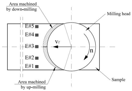 In the era of the global energy crisis [1], lightweight alloys are being used to manufacture elements for various types of vehicles. These alloys are characterised by a high strength-to-weight ratio due to their low density and reducing energy consumption (electric or fuel) during the exploitation of vehicles manufactured of these alloys [2]. The lightweight alloys often are represented by aluminium alloys, which are used in manufacturing process elements for automotive [2,3], aerospace [4,5] and rail [3]. The main range of components manufactured from thin sheets of aluminium alloys, which require a high proportion of milling in the manufacturing process, are front panels for control systems, housing parts for electrical and electronic components. For these components, both dimensional and surface quality are important aspects of production, especially if the machined surface is also intended to serve as a heat or/and radiation shield. In the manufacturing process of aluminium alloy components, blank (semi-finished) products with small machining allowances are often used to reduce costs [6,7]. This is largely made possible by the cold rolling process used in manufacturing metallurgical materials from aluminium alloys, which allows obtaining fairly low and stable dimensional tolerances [8]. An additional solution for cost reduction is the application of only single fixing while machining. Unfortunately, these solutions carry the risk of a significant effect of residual stresses remaining after the cold rolling process on the results of the machining process [9,10,11]. The cold rolling process introduces anisotropic properties by deforming plastically the processed material. This anisotropy significantly affects the mechanical properties of aluminium alloy sheets [12]. Although the cold rolling process is often followed by stress-relieving processes, there are still residual stresses at the sheet surface [13,14]. Residual stresses occur on both sides of the sheet, which creates a certain balance to ensure the right shape and dimensions. Hattori et al. [15] showed that residual stresses after the cold rolling process of aluminium alloy occur up to a depth of about 1 mm and reach up to 50 MPa. In the case of thin sheets (up to 12 mm thick), this constitutes a significant part of the whole thickness. Therefore, the removal of material with residual stresses from one side of the sheet may lead to deformation of the element due to the residual stresses on the surface of the other side of the sheet. This phenomenon was observed by Dobrzynski et al. [16] while analysing flatness after the face milling process with different strategies. The residual stress distributions created after plastic deformation can be predicted by numerical models or algorithms presented in works by Ding et al. [17], Mutafi et al. [18] and Chen et al. [19]. Sedlak et al. [20] showed that residual stresses are also created after the face milling process. Dobrzynski et al. [16] showed that strategies of removal of material while face milling of cold-rolling thin plates have a significant effect on flatness deviations. The previous work [21] showed that the direction of paths of the face milling process in relation to the cold rolling direction of aluminium alloy plates, considering the anisotropy of the rolled material, also affects the flatness of machined surfaces. Pimenov et al. [22] in their work proposed a mathematical model for determining the deviation from flatness, taking into account the parameters of milling and tool wear. The successful experience of monitoring flatness deviation, depending on the flank wear of the cutter and the engine power of the machine using an artificial, tool is shown in [23]. Additionally, Nowakowski et al. [24] noted in their work that the strategy of the face milling process also affects the heat flux at the tool–workpiece interface, which determines the temperature in the entire thermodynamic system.