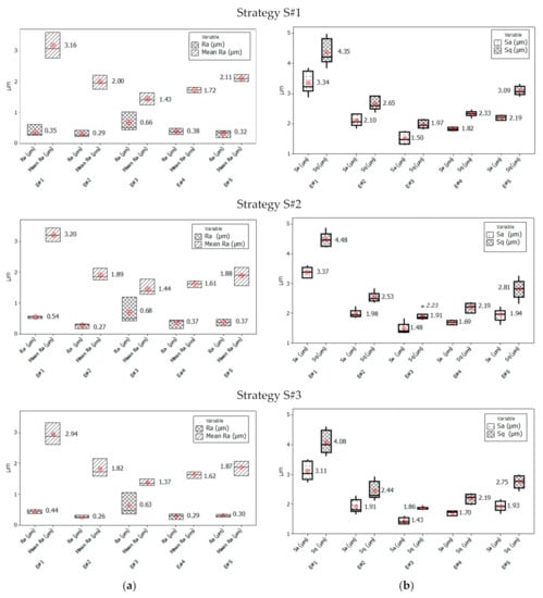 Centre and spread of 2D (a) and 3D (b) surface roughness parameters for three milling strategies: S#1, S#2 and S#3. 2D parameters (a): Ra for the mean R profile and mean Ra parameter. 3D parameters (b): Sq and Sa parameters. The box plot presents the mean, the median, the interquartile range box and the range of the data. E#1, E#2, E#3, E#4 and E#5 are names of measurement areas. * Outlier value Sq = 2.23 μm, in 3D (b).