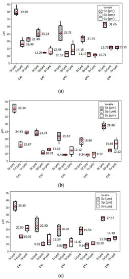 Centre and spread of Sz, Sp and Sv parameters for three milling strategies: S#1 (a), S#2 (b) and S#3 (c). The box plot presents the mean, the median, the interquartile range box and the range of the data. E#1, E#2, E#3, E#4 and E#5 are names of measurement areas.