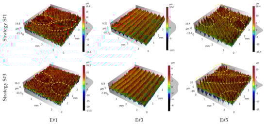 The highest median value of the Sz parameter of nearly 40 µm was obtained at the beginning of the up-milling operation for area E#1 for S#1 and S#2 strategies. This phenomenon is probably caused by the fact that these areas are also the beginning areas for the whole cutting process by individual blades. The application of the S#3 strategy allowed obtaining better results by nearly 5 µm (Sz = 35.32 µm). Analysing the Sp and Sv parameters, it can be observed that the distribution of heights (represented by the Sp parameter) and valleys (represented by the Sv parameter) in the case of the S#1 strategy was the most homogeneous (Figure 7). As a result of the S#2 strategy, a predominance of valleys over heights was obtained for the areas milled by the up-milling movement (E#1) of the cutter. In the case of the S#3 strategy, this phenomenon also occurred, however, with less intensity. Additionally, in the case of the S#3 strategy used for areas milled by the down-milling movement (E#5) of the cutter, the spread of the results was small (Figure 7). In Figure 8, examples of the surface texture are shown. These sample surface textures satisfactorily illustrated the results presented in Figure 6 and Figure 7. The proportions between peaks and valleys are noticeable. The uniform distribution in transition areas E#3; the predominance of valleys in areas machined with up-milling motion, E#1; and the intermediate texture in the case of areas machined with down-milling motion, E#5, are visible.