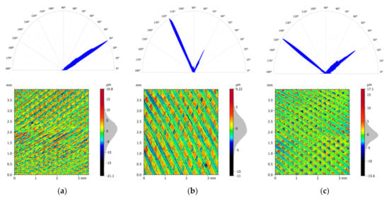 On the side clamped by the movable jaw in the areas close to the edge of the samples (E#5), both directions of 30° (first blade passage) and 146° (subsequent blade passage) were present. The dominant texture grooves after the next blade pass (similarly as for the E#4 areas) were obtained for the thinnest samples (6 mm) for strategy S#1 and both directions rolled (Figure 9c). A similar phenomenon was obtained for the samples with a thickness of 8 mm milled by strategy S#1 (semi-finished product rolled in the L_R direction), but in this case, the percentage of isotropy was at a relatively high level (44.6%) (Table 5). This situation was also observed for strategies S#2 and S#3 for samples rolled in the T_R direction.