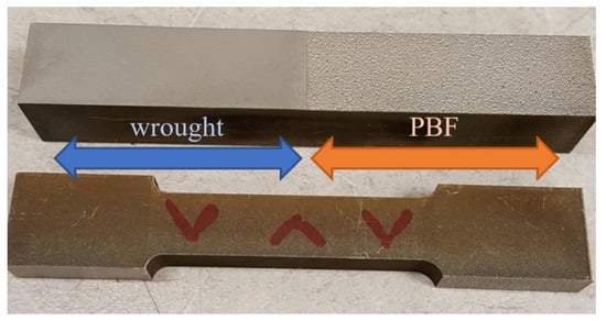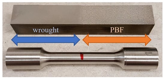 The blocks of wrought material and blocks produced using PBF were machined into the test specimens to evaluate the tensile and torsional responses, following ASTM E8 specifications [24]. Photographs of the sample PBF/wrought specimens are shown in Figure 1 and Figure 2.